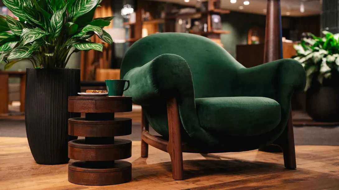 With wide, open arms and generous proportions, the chair supports a range of seating positions. Its performance velvet upholstery in deep Starbucks green adds warmth and texture, while rounded arms and walnut legs help soften the space. All of these elements serve a simple idea: comfort helps make connection possible.